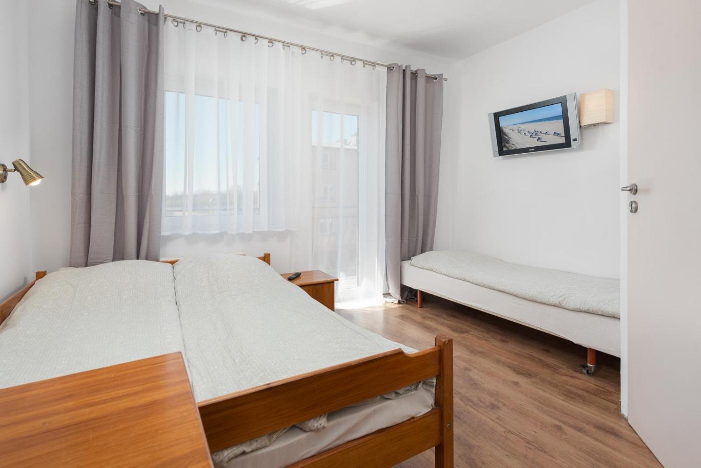 Pokój trzyosobowy z balkonem. The triple room offers a tea and coffee maker, a dining area, a balcony with a quiet street view as well as a private bathroom boasting a walk-in shower. The unit has 2 beds. Pokój Trzyosobowy - 3 osobowy. Powierzchnia pokoju ok.: 14 mkw. ;
